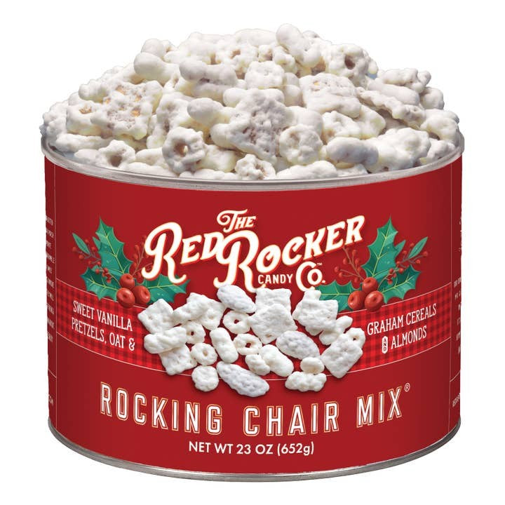This mix of candied-coated pretzels, oat cereal, graham cereal and almonds is the perfect holiday snack or gift! The sweet coating is a delicious, silky, white confection. It comes in our signature holiday Santa- wrapped tin.